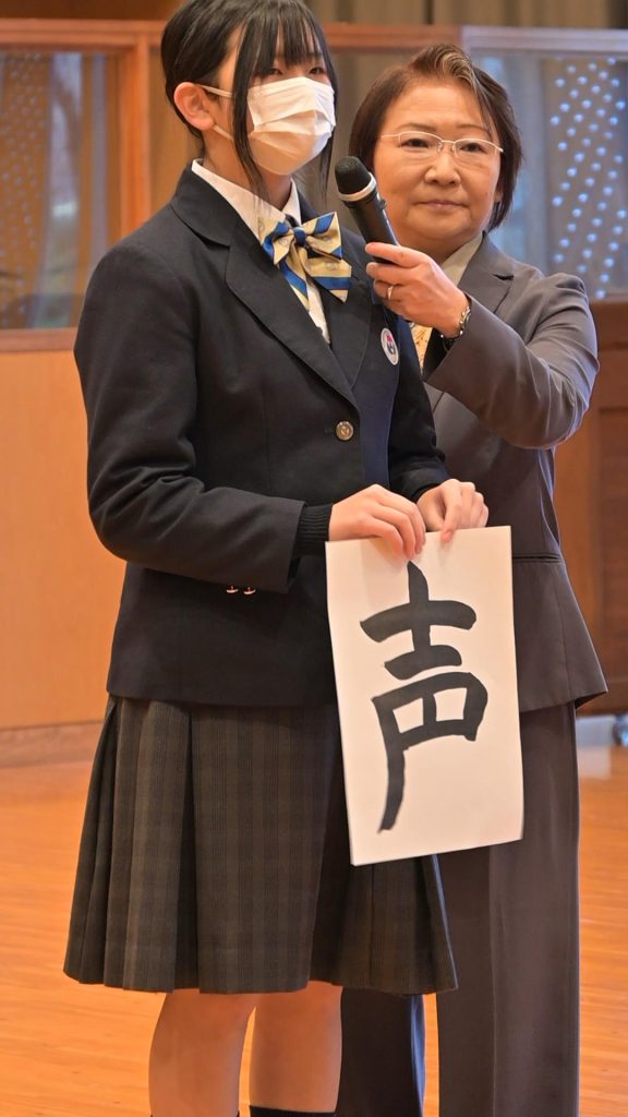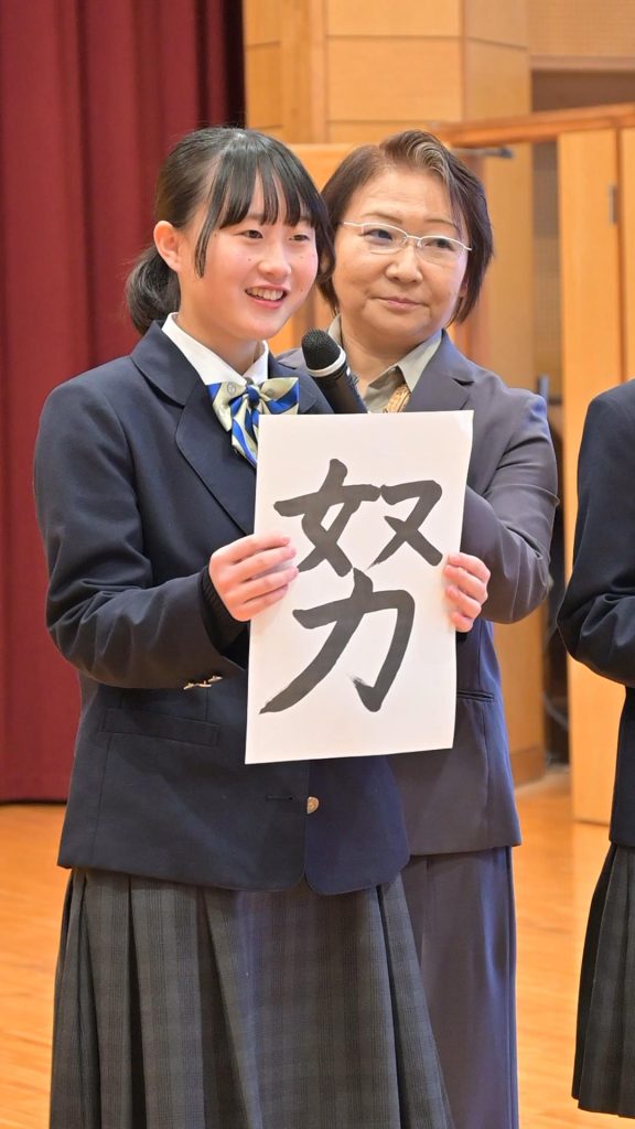1月21日(水)の中学校集会では、その書とともに、自分が選んだ漢字に込めた決意を発表しました。