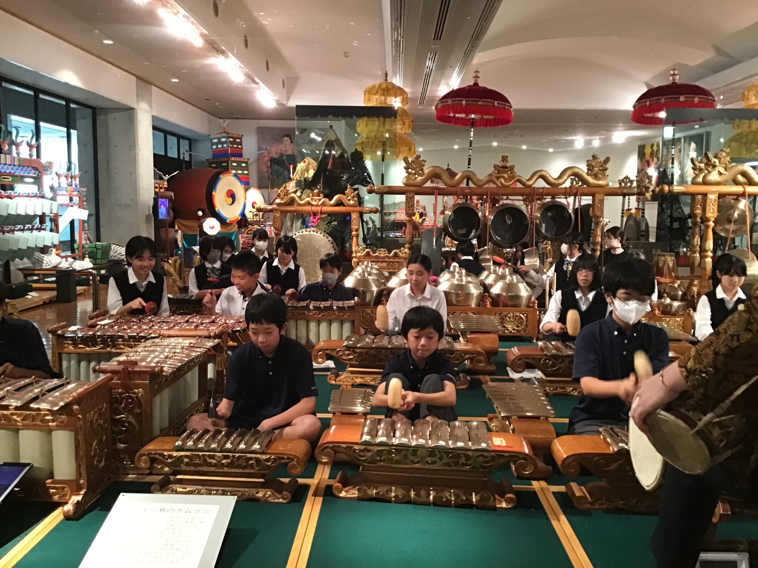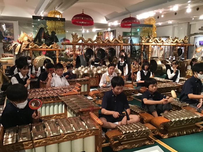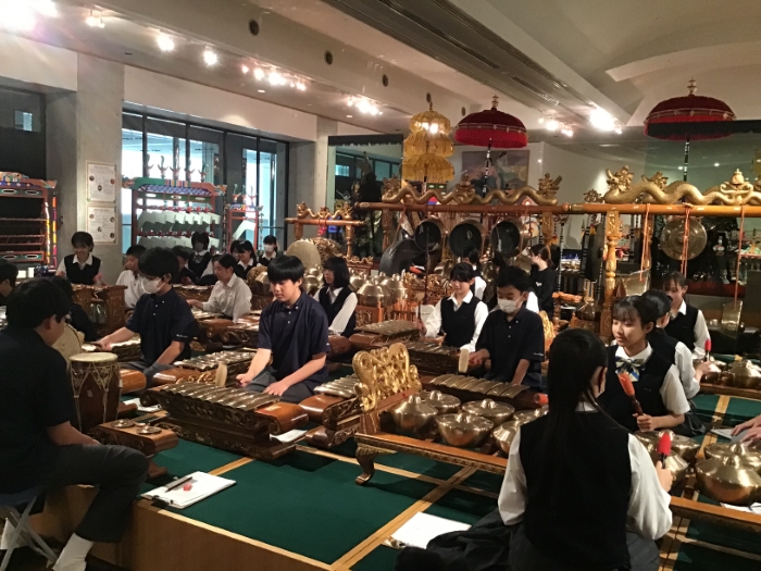 ガムラン体験では、博物館の学芸員の方による指導を受けながら楽しくインドネシアの文化を体験できました。全ての生徒にとってガムランに触れ演奏することは初めての体験であり、その力強くも不思議な音色に驚き、感動した様子でした。