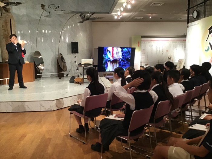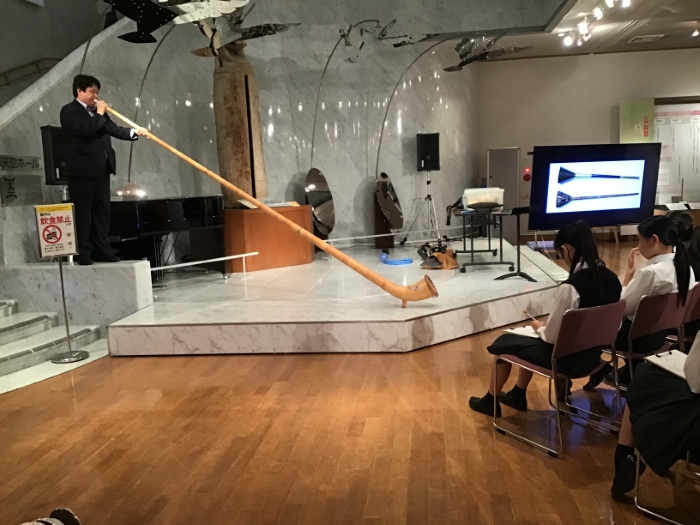 博物館見学では、音楽科・田上先生の指導のもと、事前に学習した世界各国の伝統楽器について発表。同級生の発表に耳を傾け、一生懸命に各国の楽器や音楽文化について学びました。