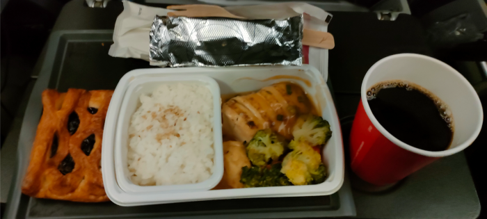 機内食は2回!チキンかビーフかパスタか、飲み物は何にするか――各自で注文していました。どれも美味しく、国際線ならではの雰囲気を楽しんでいました。