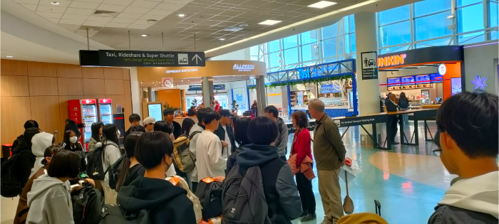 バスの中ではカラオケ大会が始まりました。東京では夜景の美しさにも歓声が上がり、みんな元気に成田に到着。初めてのチェックインに戸惑う生徒も多い中、無事に手続きを終えて飛行機に搭乗しました。この日は機内泊です。