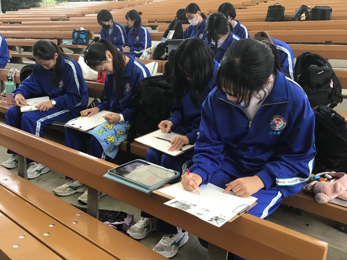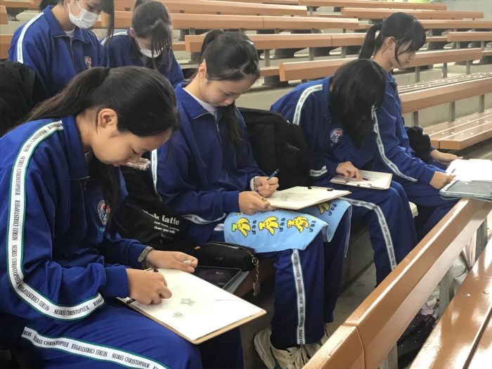 園内では、色鮮やかなコスモスの花々や、英国庭園に咲く珍しい花々など、見どころがたくさんありました。生徒たちは思い思いにモチーフを選び、集中して作品づくりに取り組みました。