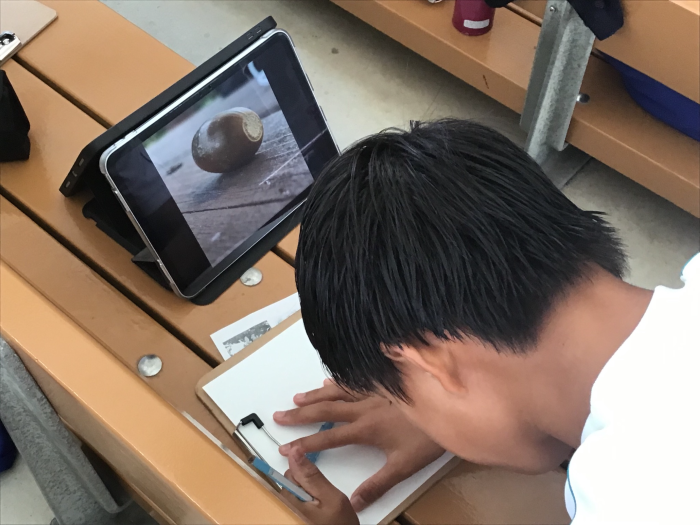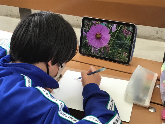 雨のため屋外での写生はできませんでしたが、まずはそれぞれが気に入った風景や花をタブレットで撮影。その後、屋内で撮影した写真をもとに鉛筆で丁寧にデッサンしました。