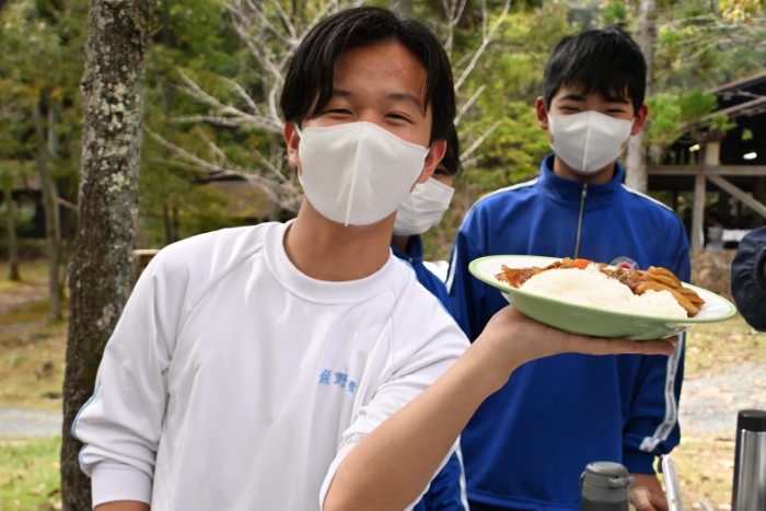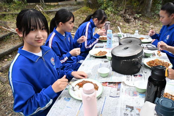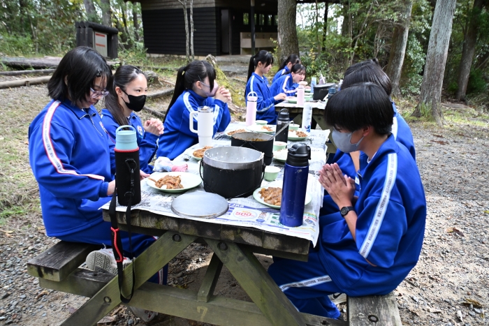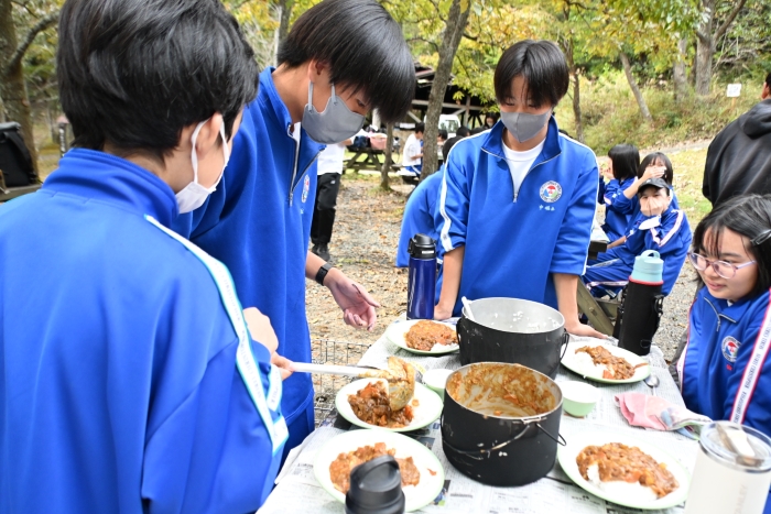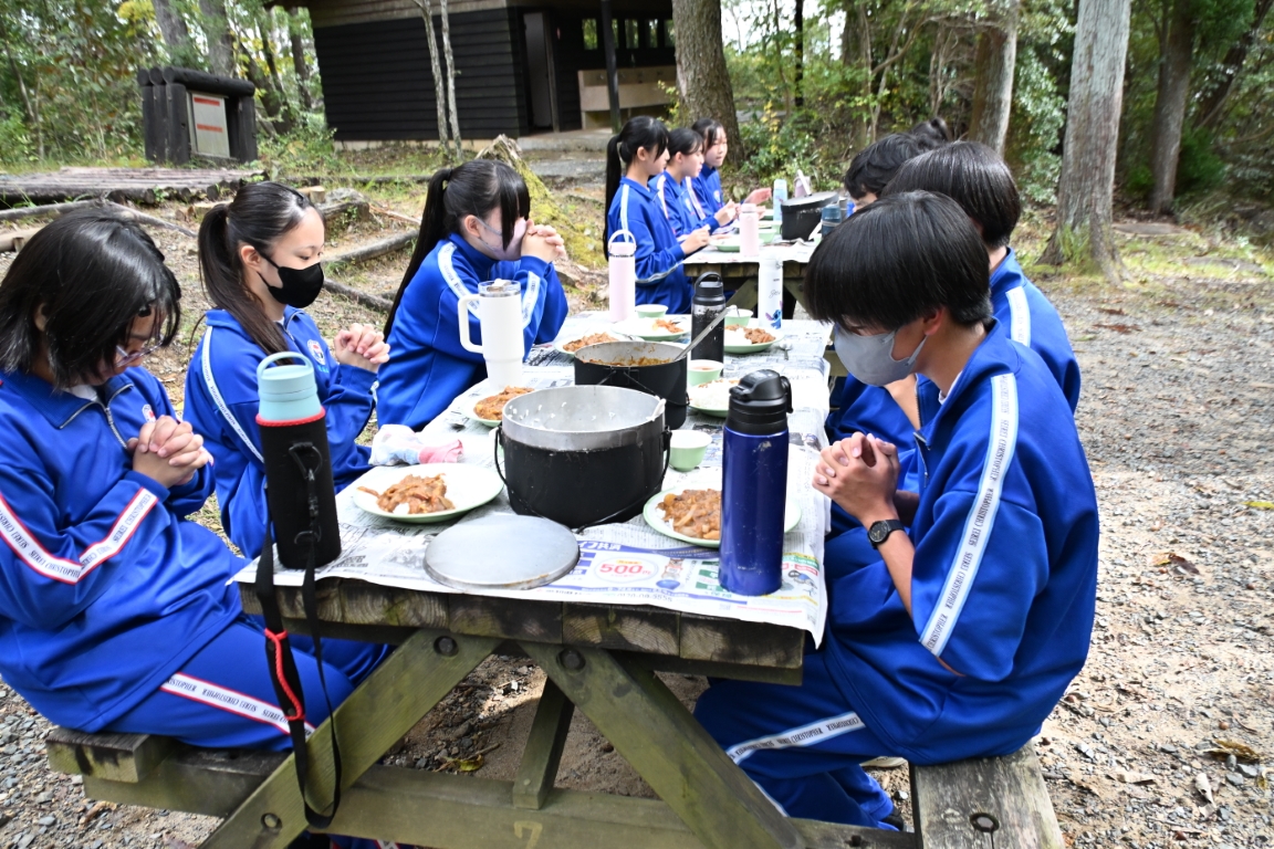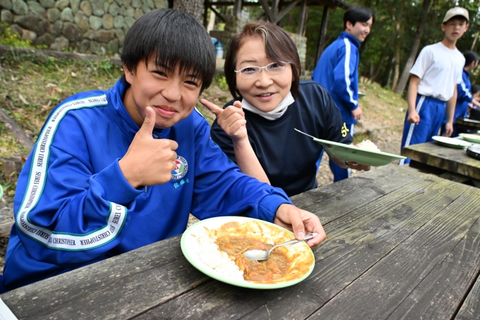 自分たちで作ったカレーを囲み、食材への感謝、かわな野外活動センターの職員の方々、スクールバスの運転手さん、そして日々食事を作ってくださる保護者の皆さんへの感謝を込めて、食前の祈りを捧げました。