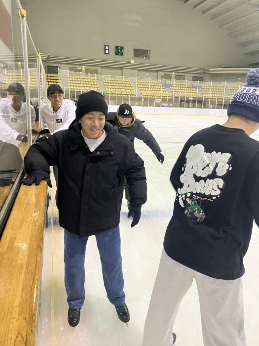 スケートコースは、慣れないスケート靴に苦戦しつつも、転びながら徐々に上達。地元の小学生が一緒に滑ってくれる場面もあり、笑顔が絶えない時間になりました。