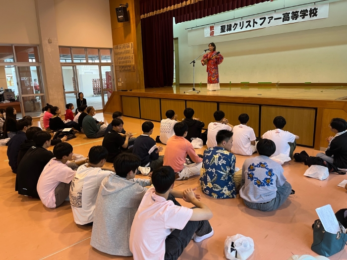 「島人ぬ宝」の生演奏による心温まる歓迎で迎えていただき、生徒たちは緊張することなく、自然と笑顔で交流を始めることができました。