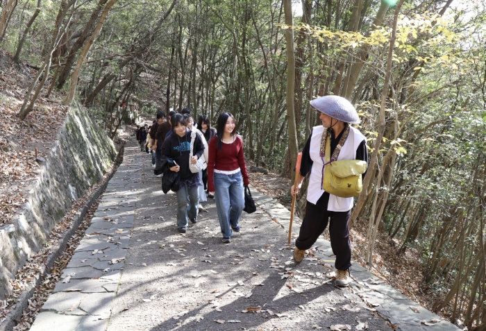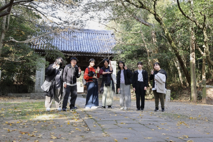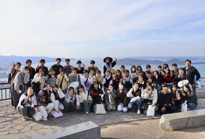 昼食後は、屋島へ行きお遍路体験をしました。お先達さんの案内で、琴電屋島駅から森の中や遍路道を通って屋島山頂へ。山頂から見える瀬戸内海と島々の景色は絶景で、登りの疲れが吹き飛ぶようでした。また、山頂ではお接待体験として地元の特産品である和三盆をいただいたり、84番札所屋島寺で参拝方法を教えていただいたりしました。