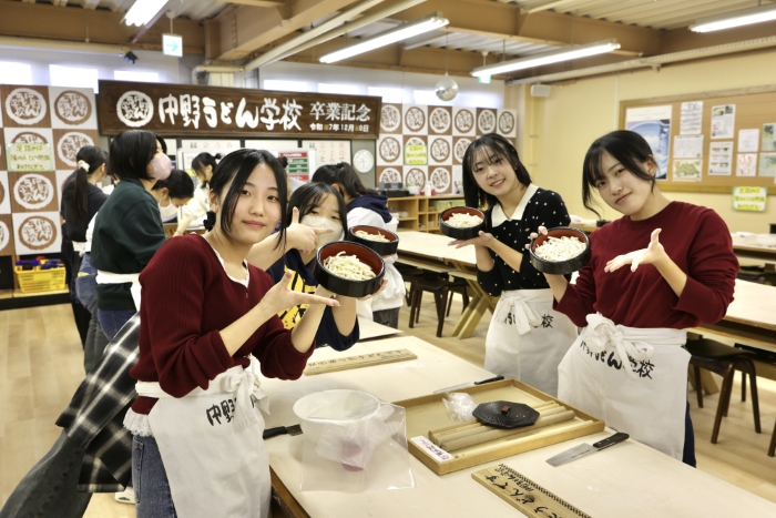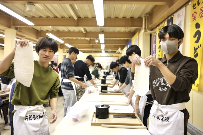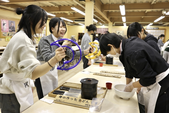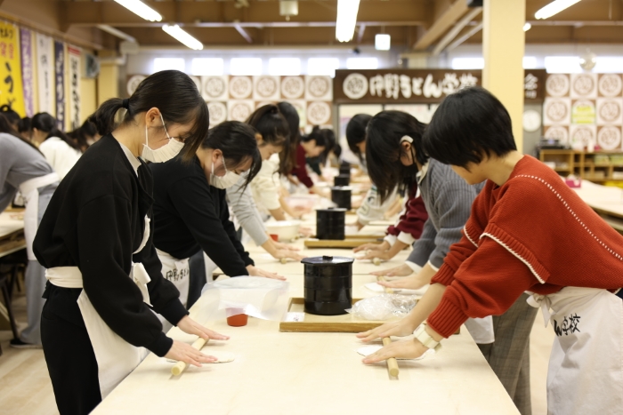 その後、ナカノヤ高松にてうどん作り体験をしました。生徒たちはノリノリで楽しそうにうどんの生地を作っていました。自分で作ったうどんは格別の美味しさだったようです。
