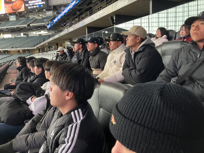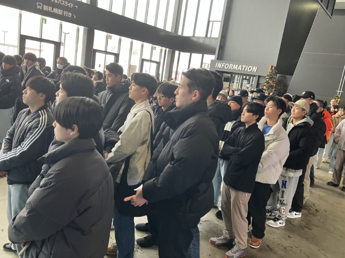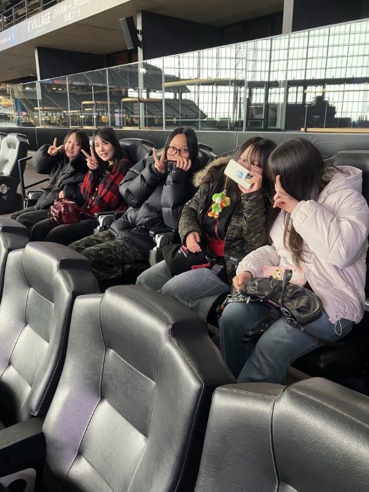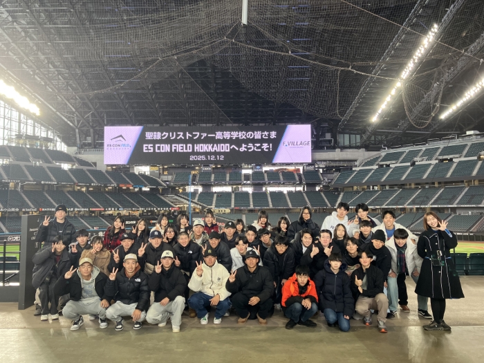 生徒たちが一番楽しみにしていたエスコンフィールドへ向かいましたが、この日の天候はまさかの大荒れ。道路状況も悪く、到着は予定より約20分遅れに。それでも、まるでテーマパークのような球場内をツアーで巡ると、あっという間の1時間。最後には、大型ビジョンに本校の名前まで映していただき、盛り上がっていました!