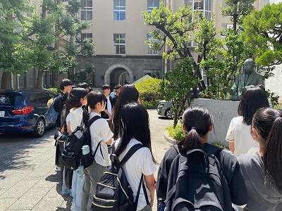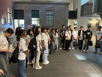 歴史ある名門私立大学ならではの伝統的な雰囲気と近代的なデザインが融合したキャンパスの雰囲気に感動した様子の生徒達。案内してくださった学生さんの大学での経験談、研究、生活の様子や早稲田大学の豆知識など、様々なお話に真剣に耳を傾け、時には驚きの声を上げる生徒達でした。