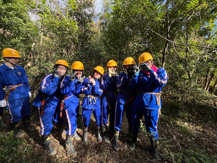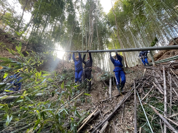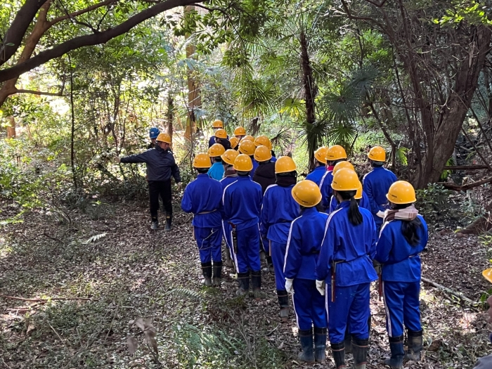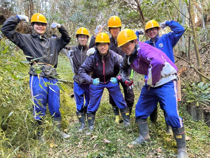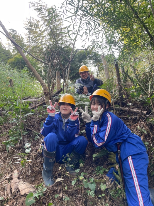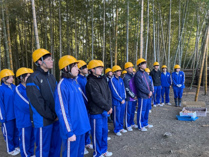 多様な樹種からなる広葉樹林に誘導するためには、毎年生えてくる若い竹を伐る必要があることから、地元自治会や森林組合による維持管理作業に本校の生徒も毎年参加し、広葉樹林への転換を図っています。