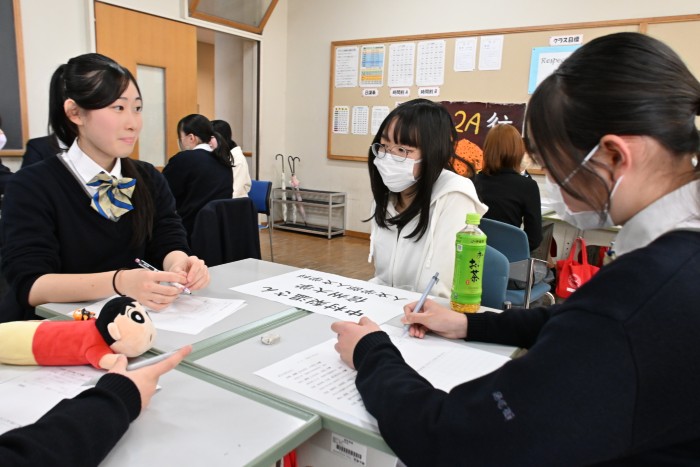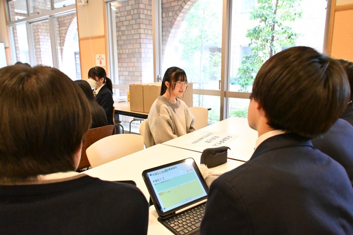 また、中学2年生に対しては、高校3年生の内進生7名が参加しました。中学生からは、勉強や部活動、生徒会活動で努力したことや、高校英数科に進んで良かったこと、学校生活で楽しかったこと、効果的な勉強方法や時間の使い方など、多くの質問が寄せられ、先輩たちが一つひとつ丁寧に答えていました。