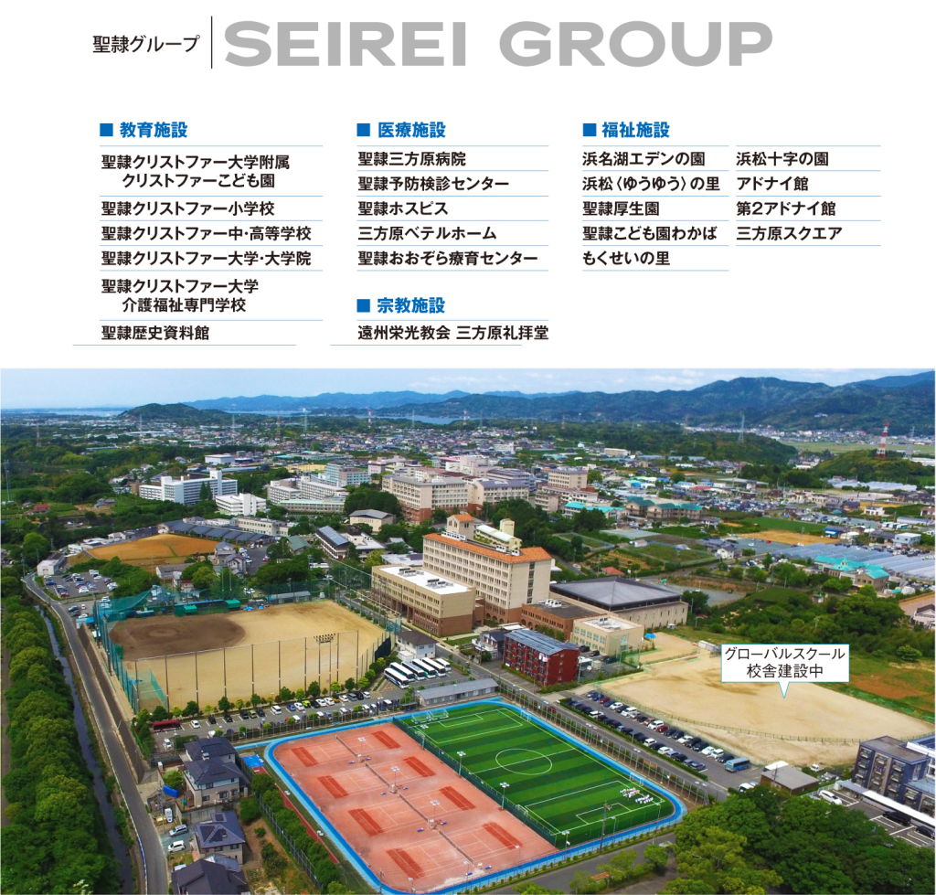 医療施設聖隷三方原病院、聖隷浜松病院、聖隷予防検診センター、聖隷健康診断センター、他福祉施設聖隷厚生園、浜松十字の園、浜名湖エデンの園、小羊学園、他教育施設聖隷クリストファー大学・大学院、 聖隷クリストファー高等学校、 聖隷クリストファー中学校、 聖隷クリストファー大学付属クリストファーこども園 聖隷クリストファー大学5号館1階に、聖隷の精神と歴史、聖隷グループを紹介する「聖隷歴史資料館」があります。