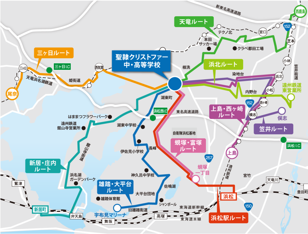 2025運行ルート&時刻表(予定) 天竜ルート 浜北ルート 上島・西ヶ崎駅ルート 笠井ルート 雄踏・大平台ルート(大平台ルート) 雄踏・大平台ルート(雄踏ルート) 新居・庄内ルート 三ケ日ルート 蜆塚・富塚ルート 浜松駅ルート直行便(中高生) 時刻表はこちら ※運行ルートの地図および時刻表に記載している乗降場所が全てになります。※道路交通状況等により運行時間が国の基準を超過する場合、時刻や経路等の改正をしなければならない場合がありますのでご了承ください。