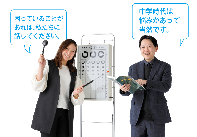 生徒一人一人が健康で安心感を持って学校生活を送れるように、身体だけでなく心のケアも行っています。中学時代は悩みがあって当然です。健康面や生活習慣、人間関係から勉強まで、もしも困っていることがあれば、私たちに話してください。話すだけでも、きっと気持ちが軽くなります。強くなくてもいいんです。落ち込んでもまた立ち上がる力を身に付けられるよう、全力でサポートします!